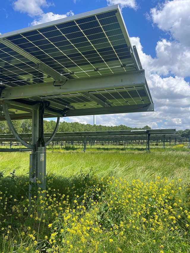Figuur 3: Voorbeeld van bi-facial zonnepanelen waarbij de panelen hoger en verder uit elkaar geplaatst zijn voor natuurontwikkeling.